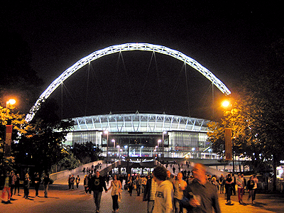 Wembley Stadium at night. Isn't it pretty.Back to our hostel again with 3 buses.